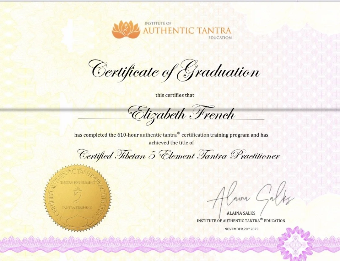 Beth French is a graduate of the Institute of Authentic Tantra Education, the only government-accredited tantra program in the world. After two years of in-depth training in trauma-aware, evidence-based tantric healing—and earning her Board Certification in Sexology—Beth now helps others reconnect with their natural capacity for pleasure.